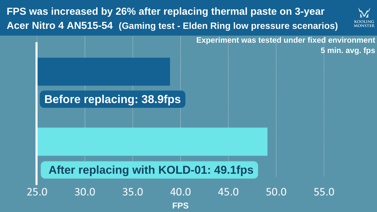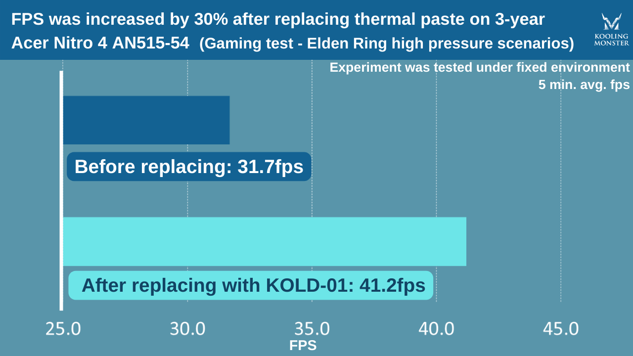 Durante scenari di gioco ad alta pressione (ad esempio durante i combattimenti), il frame rate è passato da 31,7 fps a 41,2 dopo il cambio di pasta termica.