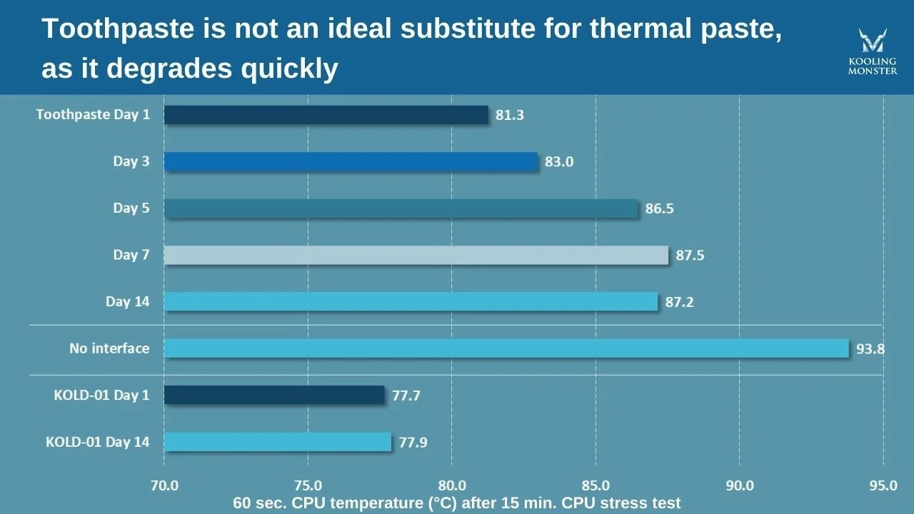 Abbiamo condotto un esperimento per verificare l'efficacia del dentifricio come interfaccia termica per la CPU di un PC. Dopo una settimana, abbiamo rilevato un calo significativo delle prestazioni di raffreddamento: la temperatura della CPU è passata da 81,3 °C a 87,5 °C. Anche se il risultato è leggermente migliore rispetto al non avere interfaccia termica (93,5 °C), è molto peggio rispetto all'efficacia di una pasta termica di alta qualità come KOLD-01, che ha mantenuto la CPU intorno a 77,7 °C.