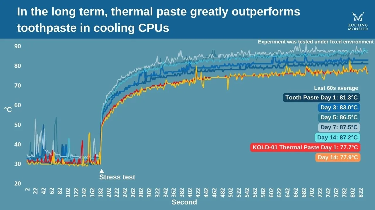 Il risultato evidenzia l'importanza di usare materiali progettati specificamente per la gestione termica della CPU. La pasta termica è studiata per garantire prestazioni e longevità ottimali della CPU, cosa che il dentifricio non può offrire. Per la sicurezza e l'efficienza del tuo computer, è meglio restare sulla pasta termica dedicata.