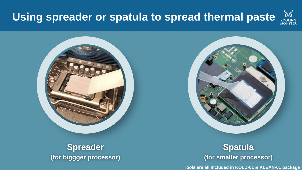 Il modo migliore per affrontare la situazione è usare uno strumento di applicazione specializzato. Per fortuna, i prodotti Kooling Monster includono uno spalmatore (spreader) e una spatola che puoi usare per questo lavoro. Sarebbe più efficiente stendere la pasta termica su un processore di dimensioni più grandi con lo spalmatore e su un processore di dimensioni più piccole con la spatola.