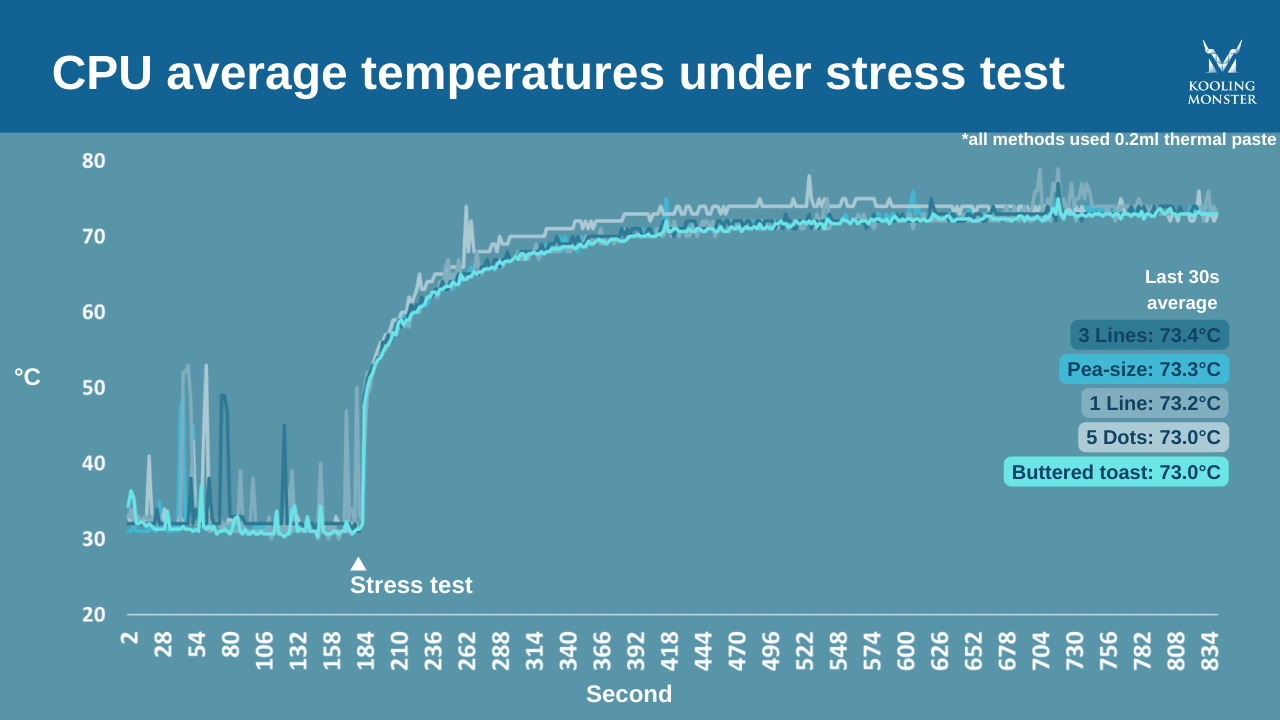 Per fare chiarezza abbiamo fatto un caso studio in cui abbiamo testato le prestazioni termiche in diverse circostanze. Di solito questi test non considerano la durata dello stress test e le diverse quantità di pasta termica che puoi usare.