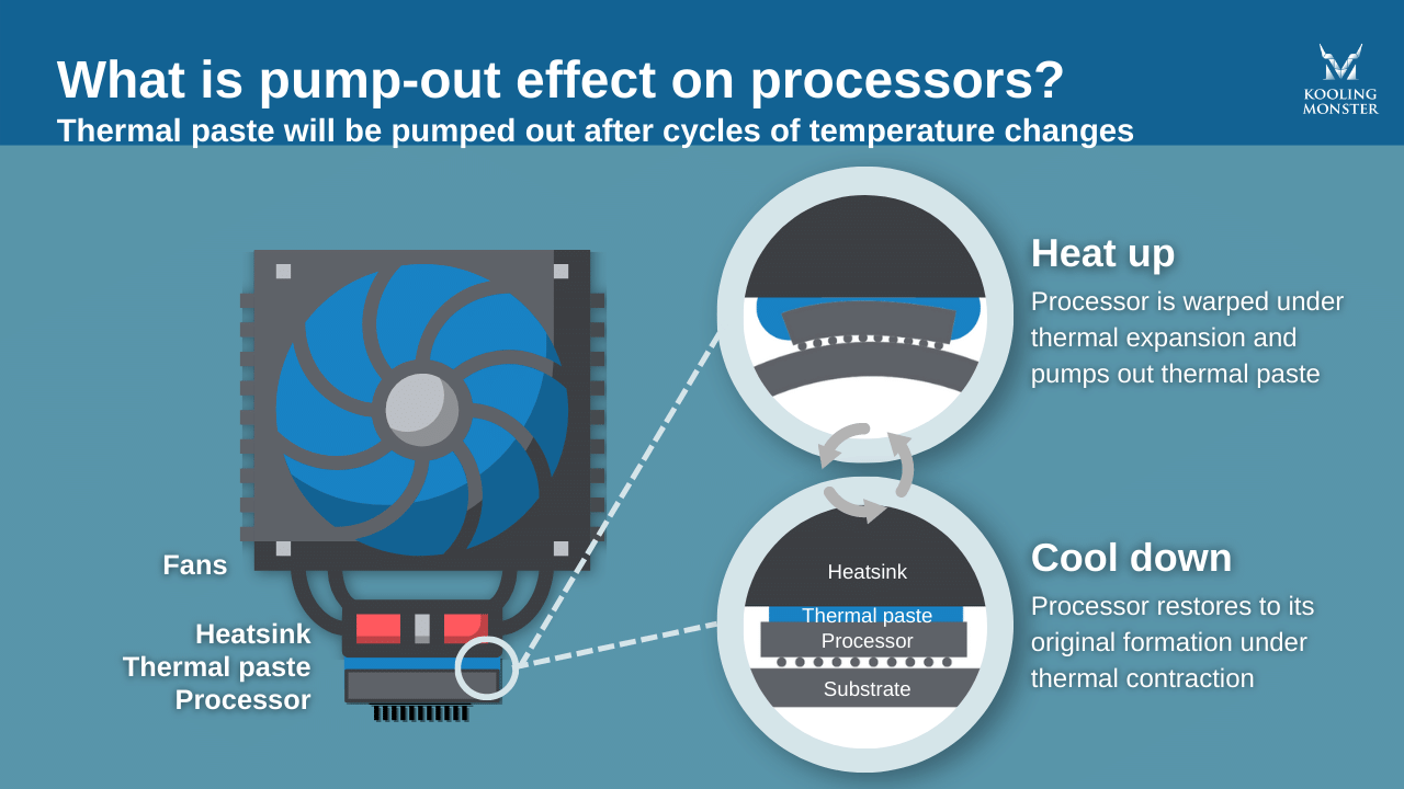 In parole povere, pump-out significa che la pasta termica viene spinta fuori dal processore centrale. Questo succede quando ci sono cambiamenti di temperatura, e il substrato e il processore si deformano a livello microscopico, muovendo gradualmente la pasta termica verso l'esterno. Generalmente, il processore avrà molti cicli in cui si scalda, poi si raffredda.
