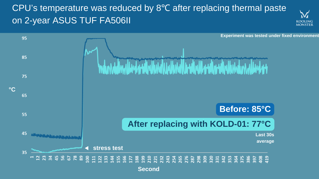 Per renderlo più chiaro, abbiamo eseguito stress test su un ASUS TUF Gaming FA506II di 2 anni, prima e dopo aver applicato la nuova pasta termica. Per questo test abbiamo usato la nostra Kooling Monster KOLD-01.