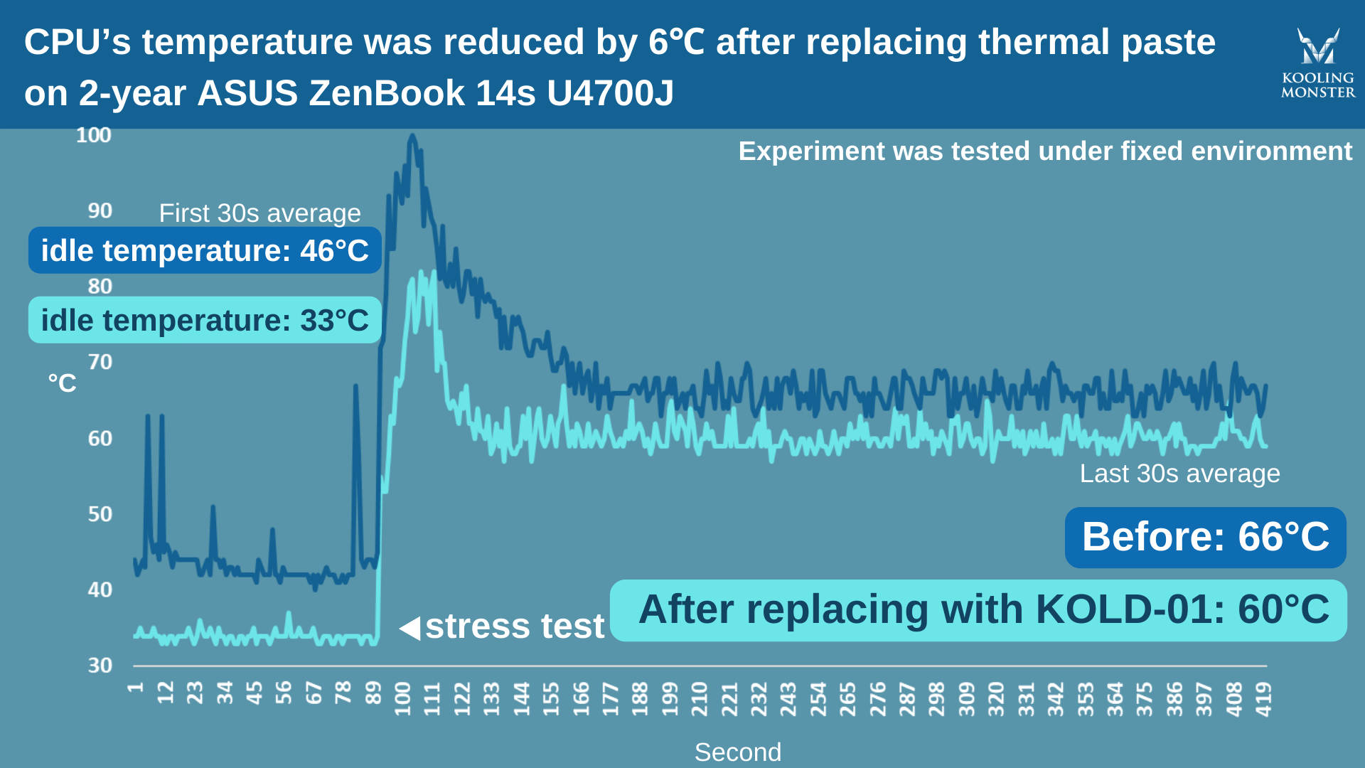 Per renderlo più chiaro, abbiamo eseguito stress test su un ASUS ZenBook 14s U4700J di 2 anni, prima e dopo aver applicato la nuova pasta termica. Per questo test abbiamo usato la nostra Kooling Monster KOLD-01.