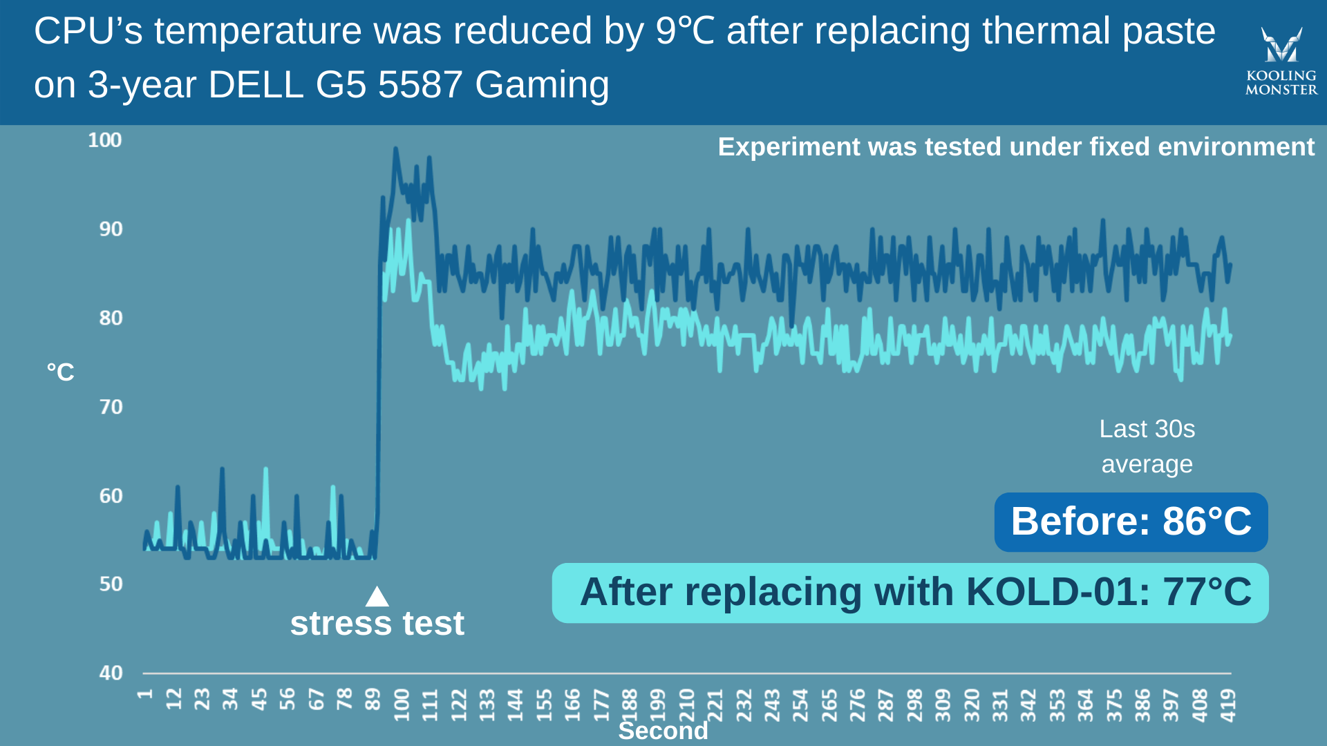 Per renderlo più chiaro, abbiamo eseguito stress test su un Dell G5 5587 Gaming di 3 anni, prima e dopo aver applicato la nuova pasta termica. Per questo test abbiamo usato la nostra Kooling Monster KOLD-01.
