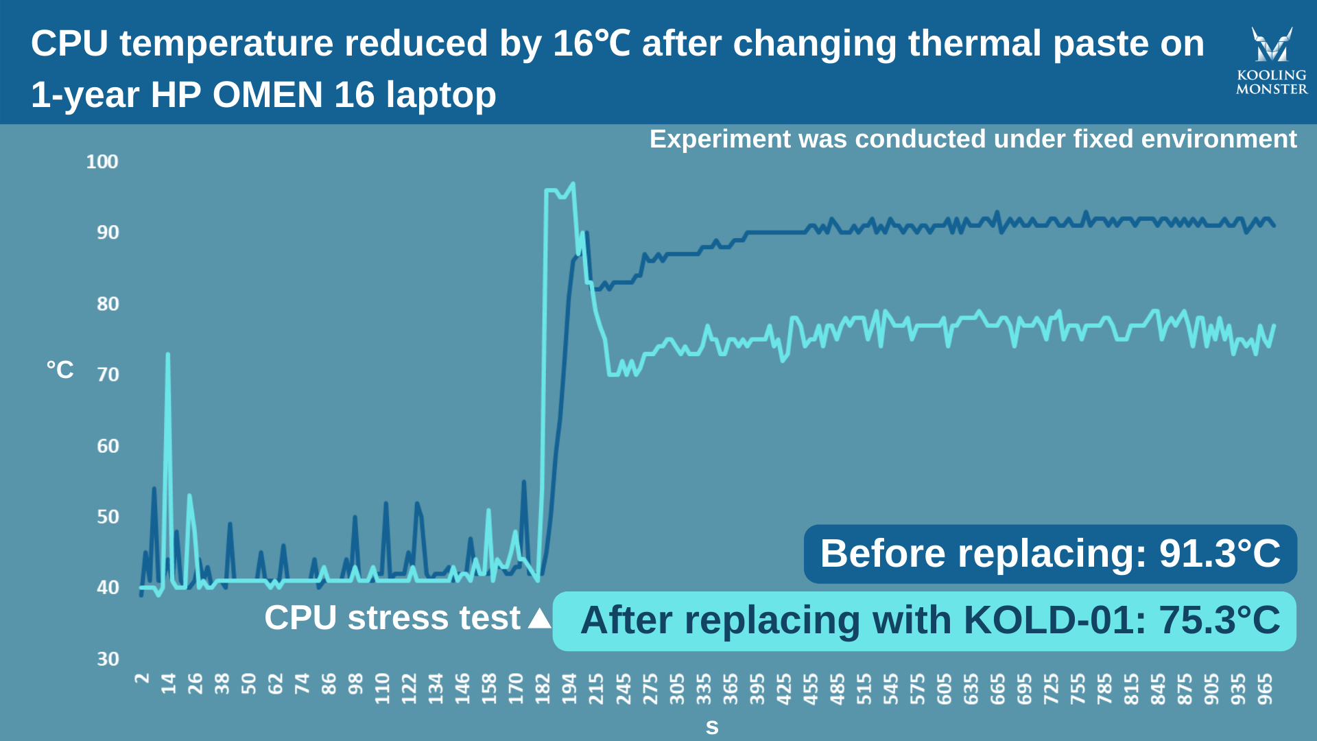Per chiarire meglio, abbiamo fatto stress test su un HP OMEN 16 di 1 anno, prima e dopo aver applicato la nuova pasta termica. Per il test abbiamo usato la nostra Kooling Monster KOLD-01.